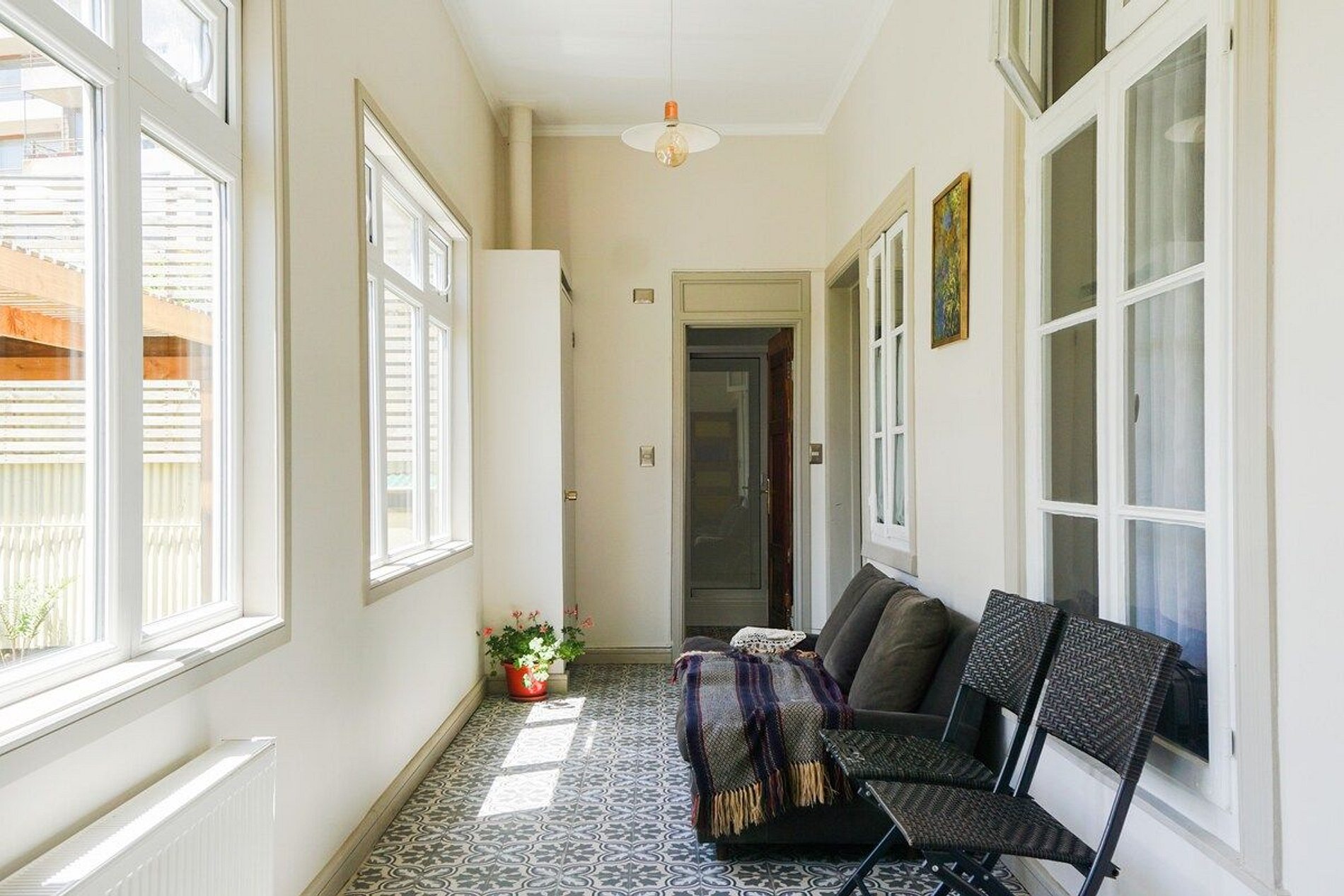 Acogedor y luminoso departamento de 2 habitaciones con cama matrimonial en una y cama individual en otra , tiene colchón inflable por si se necesita y son 4 personas, 1 baño y una cocina equipada con comedor. Hay espacios comunes en la casa como un área de escritorio y biblioteca, sala de meditación, jardines interiores con pérgola y pasillo con área de descanso, estacionamientos. El departamento queda dentro de una casa multifacética, con aire templado y con un estilo valdiviano muy propio.
