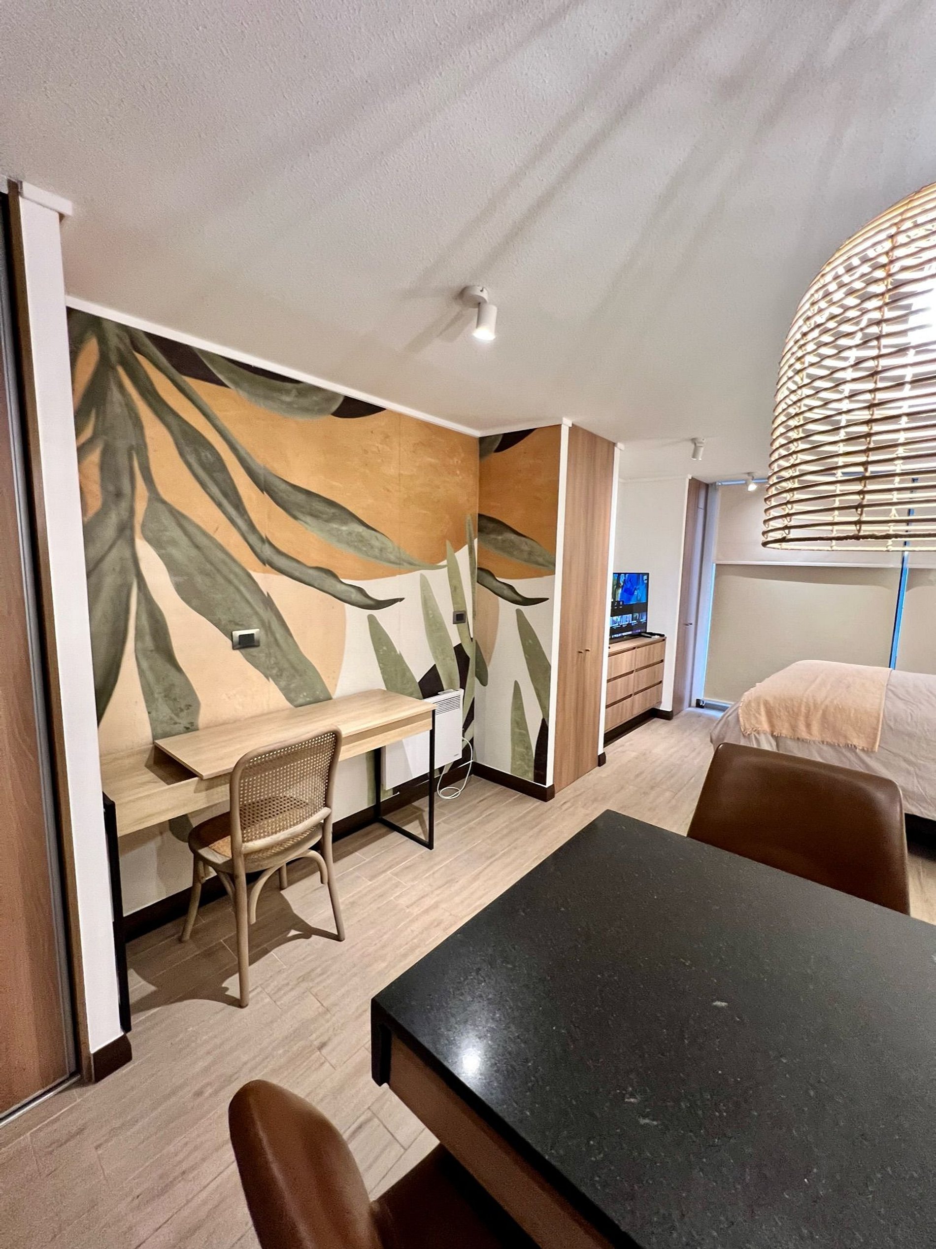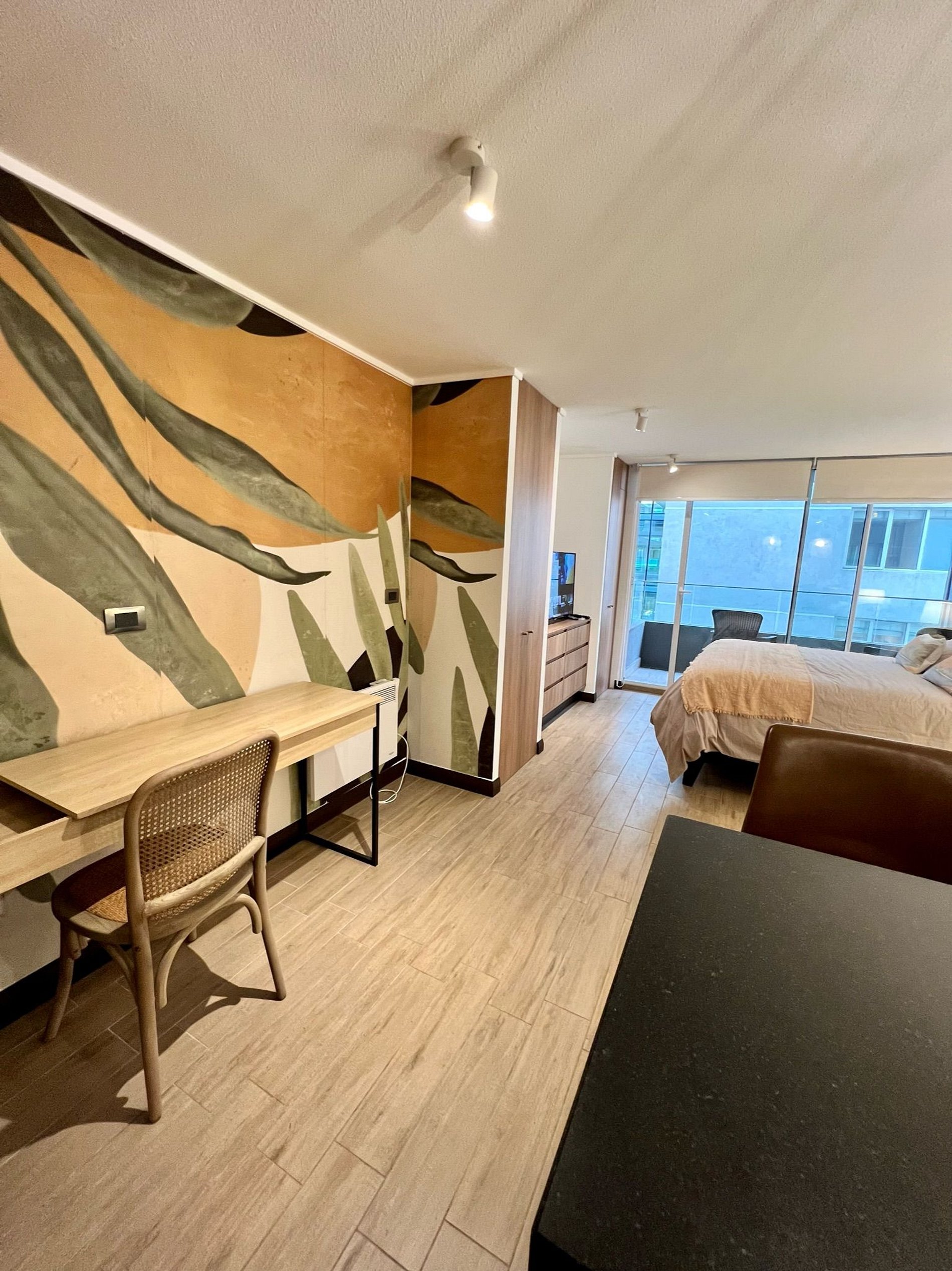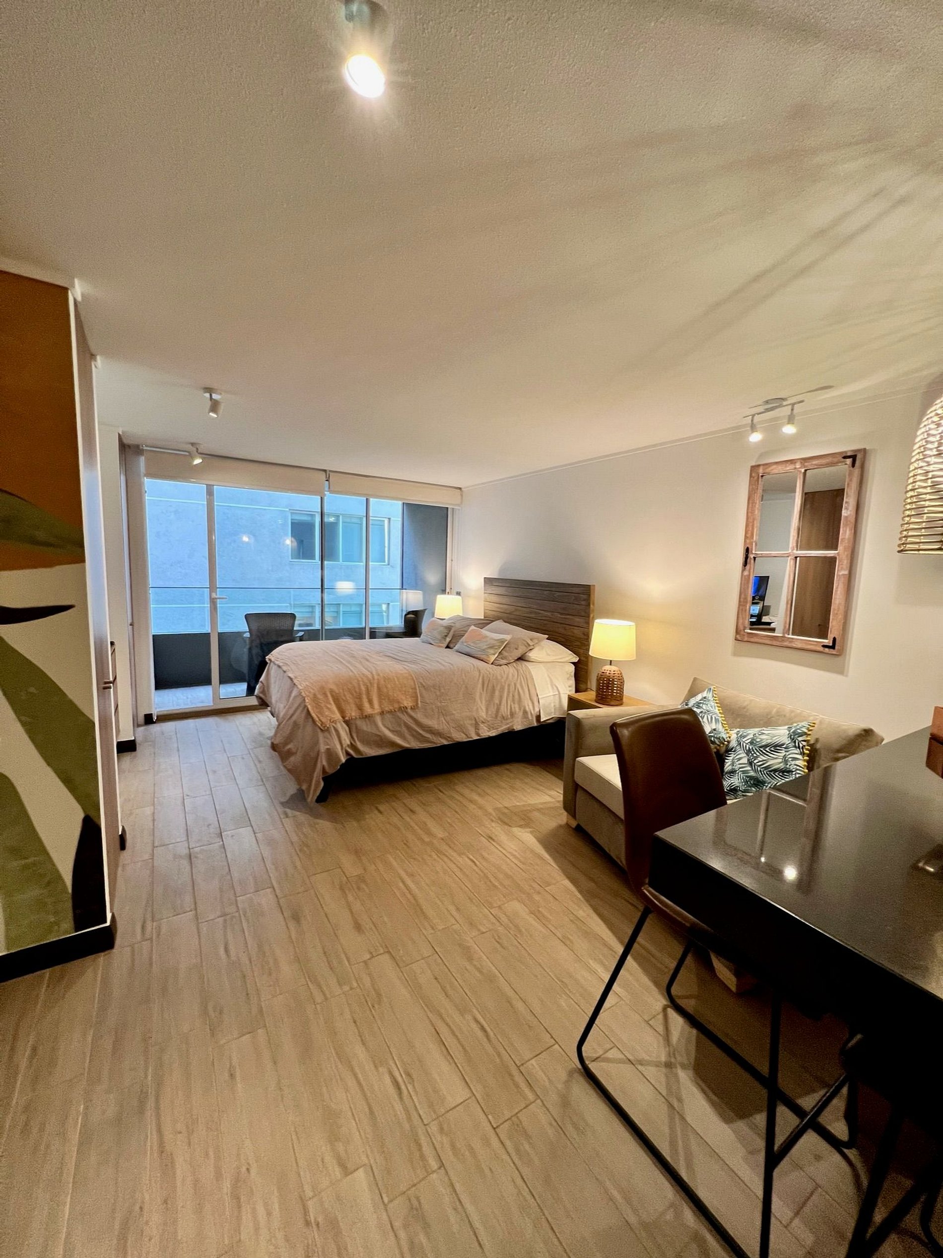Cómodo y funcional studio con estacionamiento privado, wifi de alta velocidad y terraza, ideal para trabajo remoto o descanso. Cuenta con cama de 2 plazas, escritorio y una distribución práctica para una estadía confortable. Ubicación estratégica en Estoril, a pasos de Clínica Las Condes, supermercados y servicios.